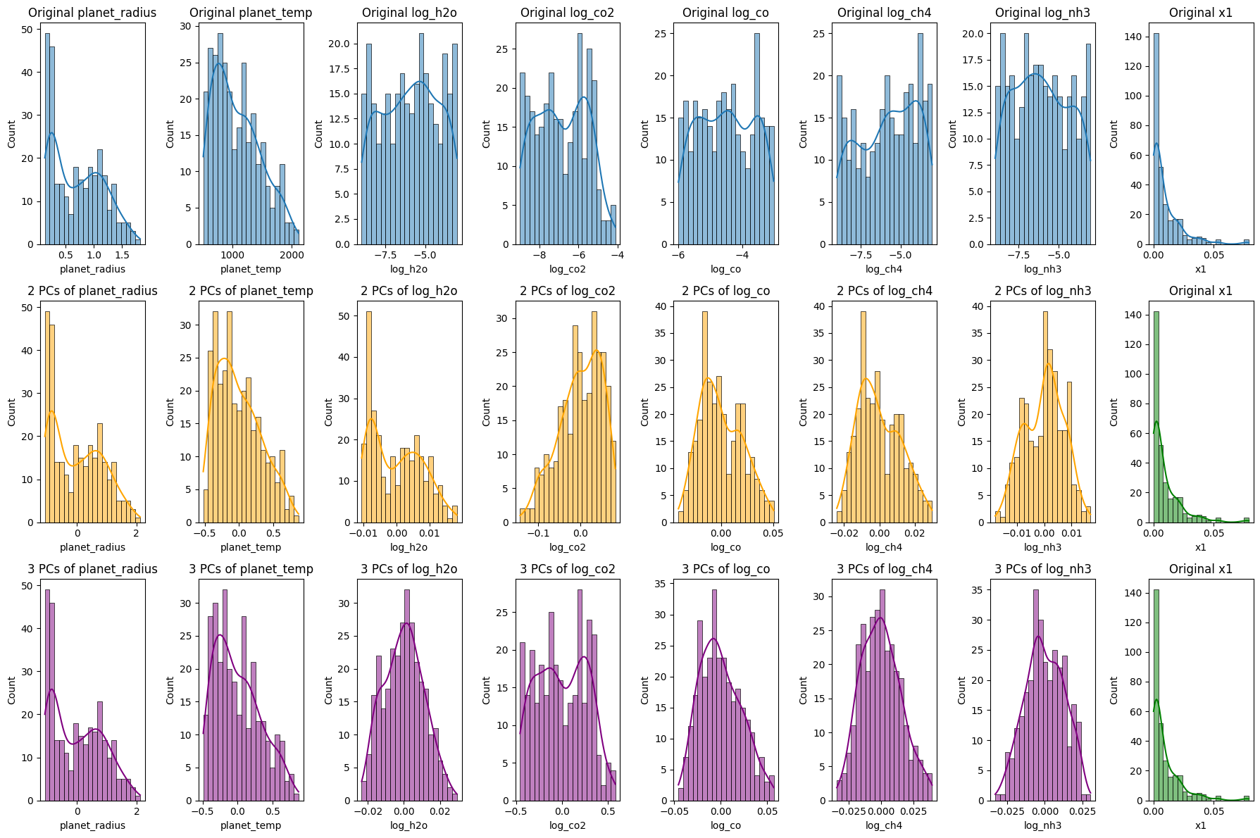 sns.histplot(reconstructed_df_3PCs[col], bins=20, kde=True, ax=axes[2, i], color='purple')