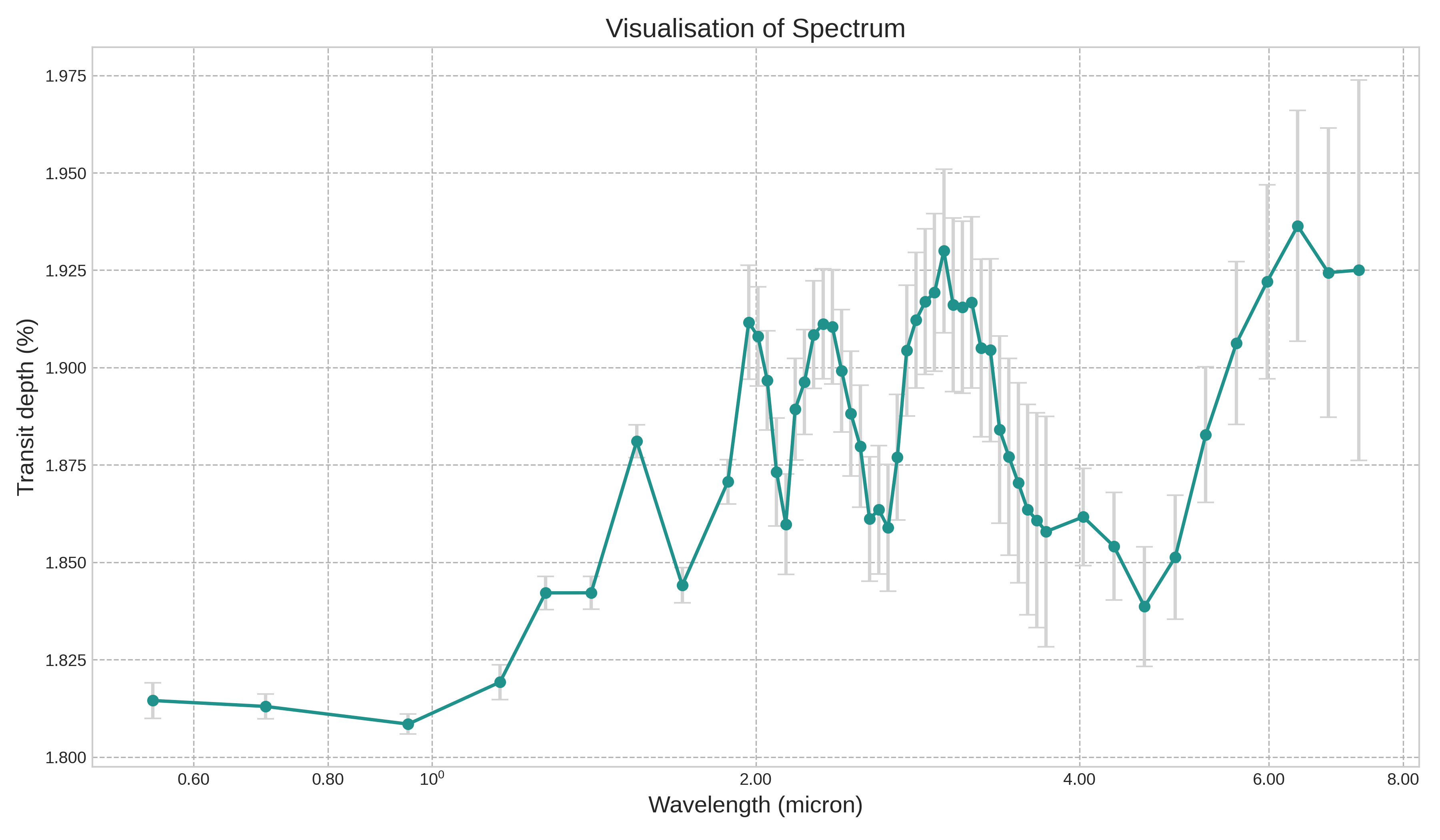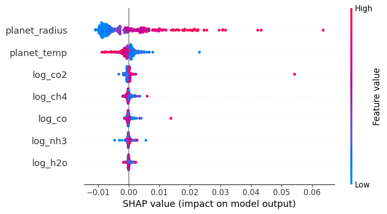 import seaborn as snsThe figure below showcases a spectrum integral to exoplanet detection, charting the transit depth against the wavelength in microns. Every observation point in the spectrum carries an inherent uncertainty, denoted by the vertical error bars. To decode and potentially minimize this uncertainty, it’s pivotal to fathom how features like planet radius, planet temperature, and the logarithmic concentrations of H₂O, CO₂, CO, CH₄, and NH₃ influence the transit depth. Leveraging interpretative tools like SHAP can provide insights into how these exoplanetary features impact the observed transit depth, refining our understanding and accuracy in exoplanet spectral analysis.