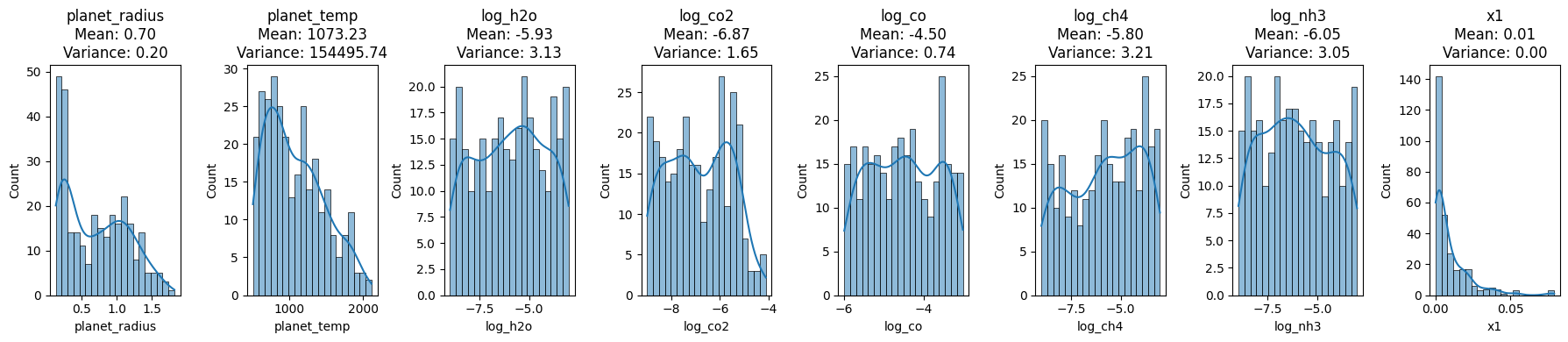 Transit Depth at x1 Wavelength: This depth, crucial for exoplanet detection, has an almost singular value near 0, with a mean of approximately 0.0094 and a negligible variance of 0.00006.